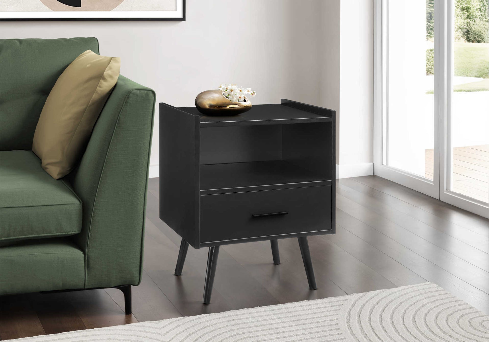 Transform your space with this sleek and stylish 24” high accent table! With a modern design, this black laminate end table is the perfect addition to any contemporary bedroom as a nightstand or living room, combining functionality with fashionable style. Crafted with durably designed solid...