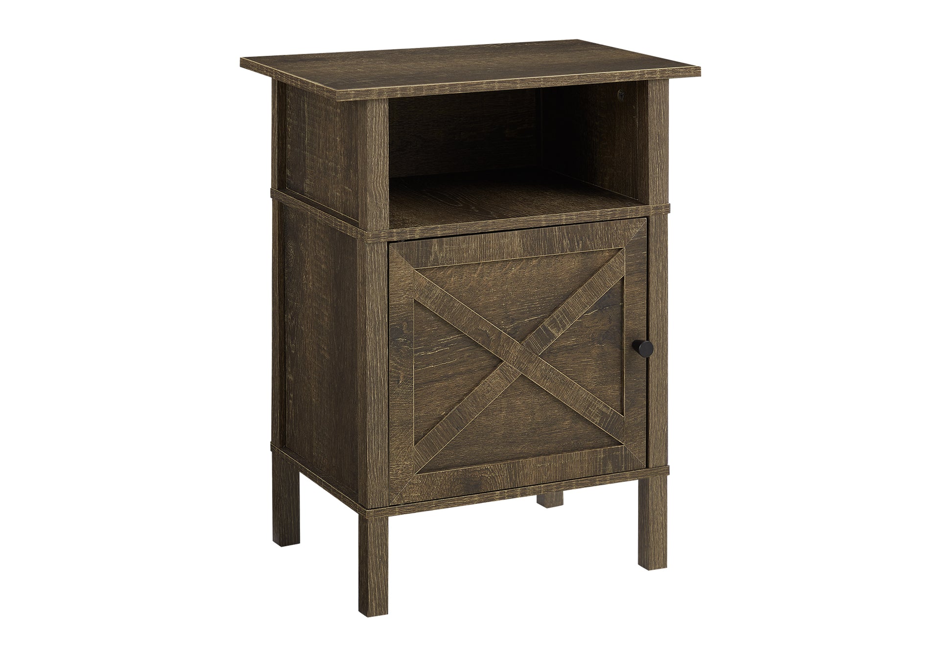 Upgrade your living room or bedroom with this versatile side accent table. Standing at 24" tall, this stylish side table features a warm dark oak laminate finish on all sides, complimented with a classic black metal knob on the cabinet door. The durably designed construction...