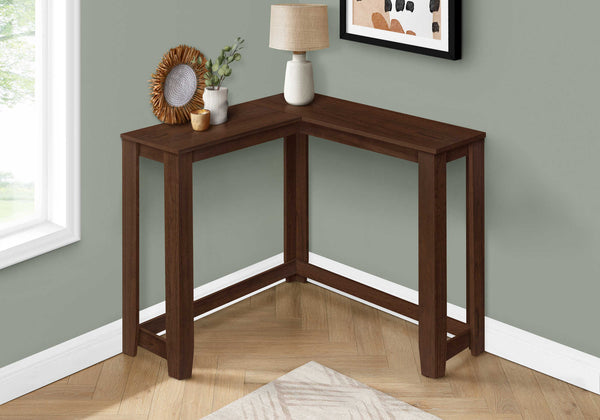 Grab your guests' attention with this stylish cherry accent corner console table. Featuring a unique space saving design and a two tiered open shelf concept, this modern unit is perfect for dressing up any corner in your home or displaying your favorite decorative items. Entry...