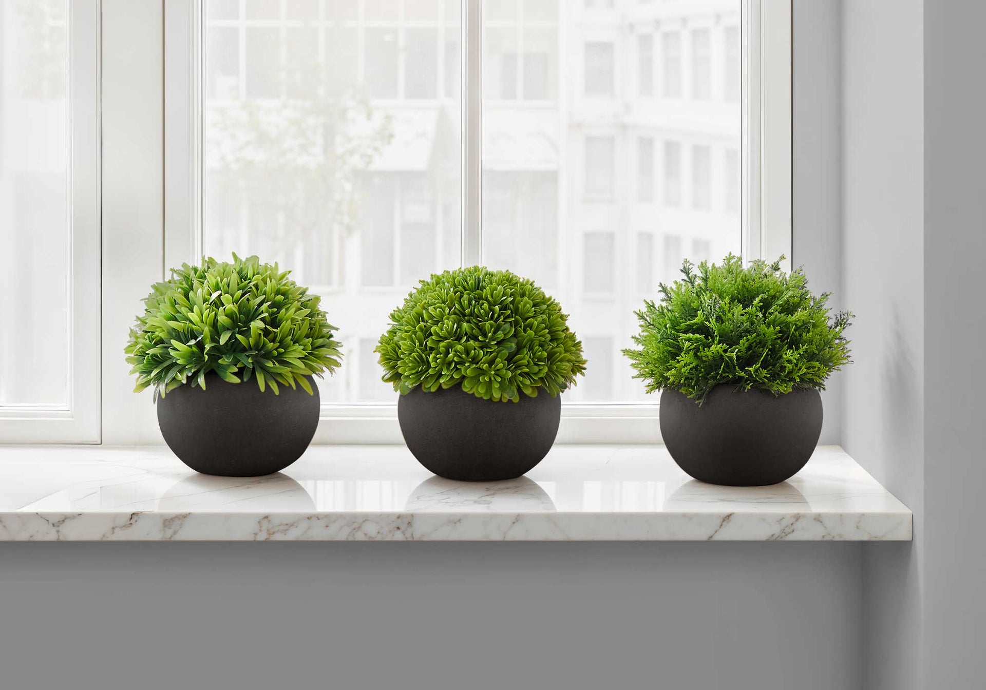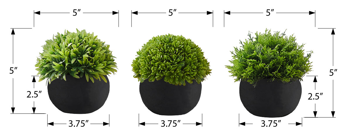 Add a decorative accent for the home or office with our amazing trio of indoor artificial plants and bring some bright greenery to your space. This 5" tall set of 3 complimentary, faux plants look stunningly realistic, firmly fixed in round paper pulp black pots....