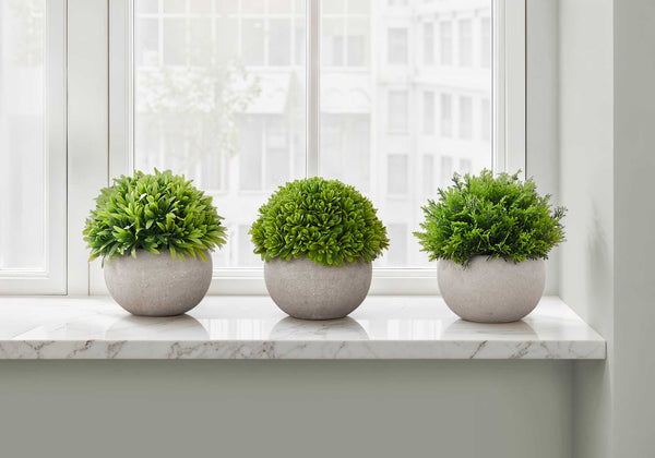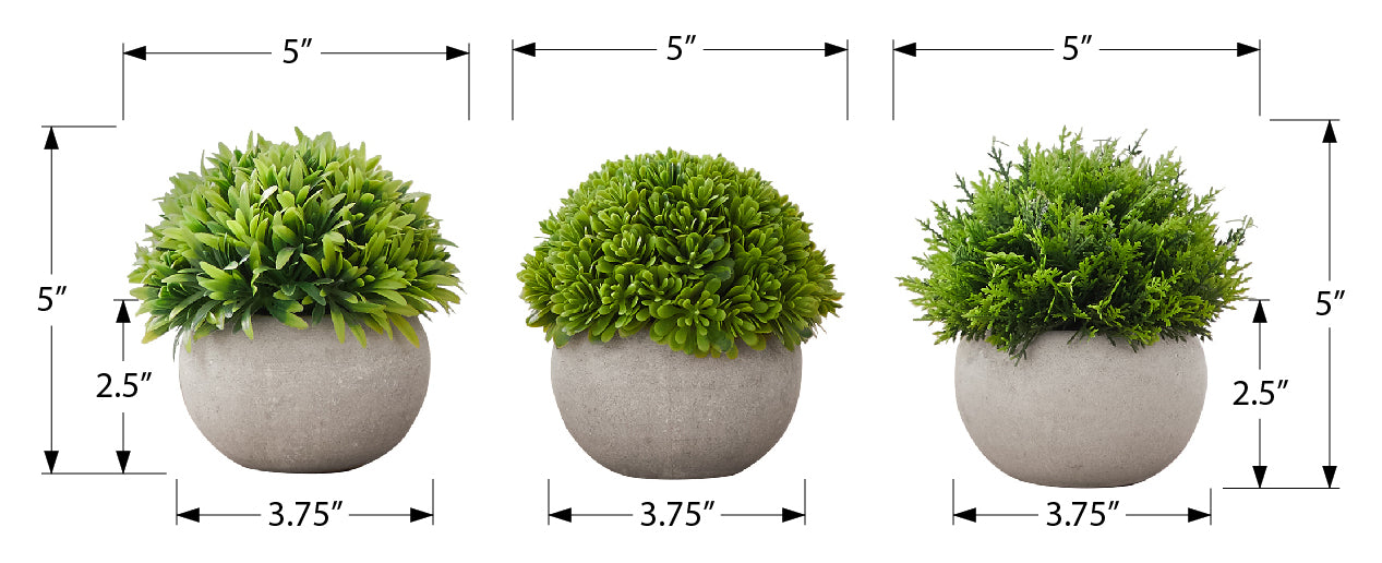 Add a decorative accent for the home or office with our amazing trio of indoor artificial plants and bring some bright greenery to your space. This 5" tall set of 3 complimentary, faux plants look stunningly realistic, firmly fixed in round, paper pulp grey pots....