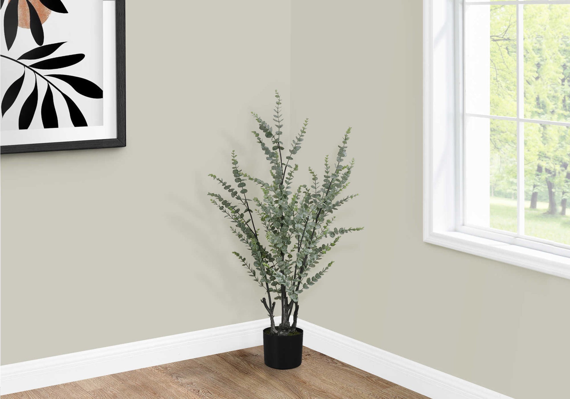 This indoor 44"H Eucalyptus artificial plant in a simple black 5" pot, topped with natural moss, it is the perfect way to add a touch of greenery to your home or office environment. This stylish, environmentally friendly faux plant is made with high-quality, durable materials...