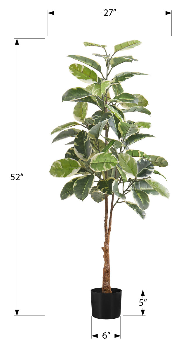 Add some style to any contemporary and modern home or office with this 52" tall artificial Rubber tree plant. This gorgeous faux tree comes already potted in a simple 5" black pot with 72 leaves and a real-touch feel in a lively green color edged...