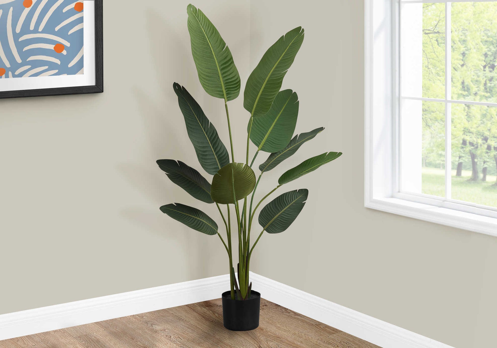 Introducing the 60" tall Bird of Paradise artificial plant in 5" black pot, a stunning piece of greenery perfect for sprucing up any style of room! This faux indoor plant features 10 leaves with a soft silky touch in a real-look green finish, adjustable to...