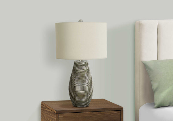 Bring some contemporary boho glamour to any room with this stylish 24"h table lamp. A beautiful blend of a vase shaped, textured finish grey resin base with a raised dotted pattern and ivory fabric shade, and finished with a round silver metal finial on top,...