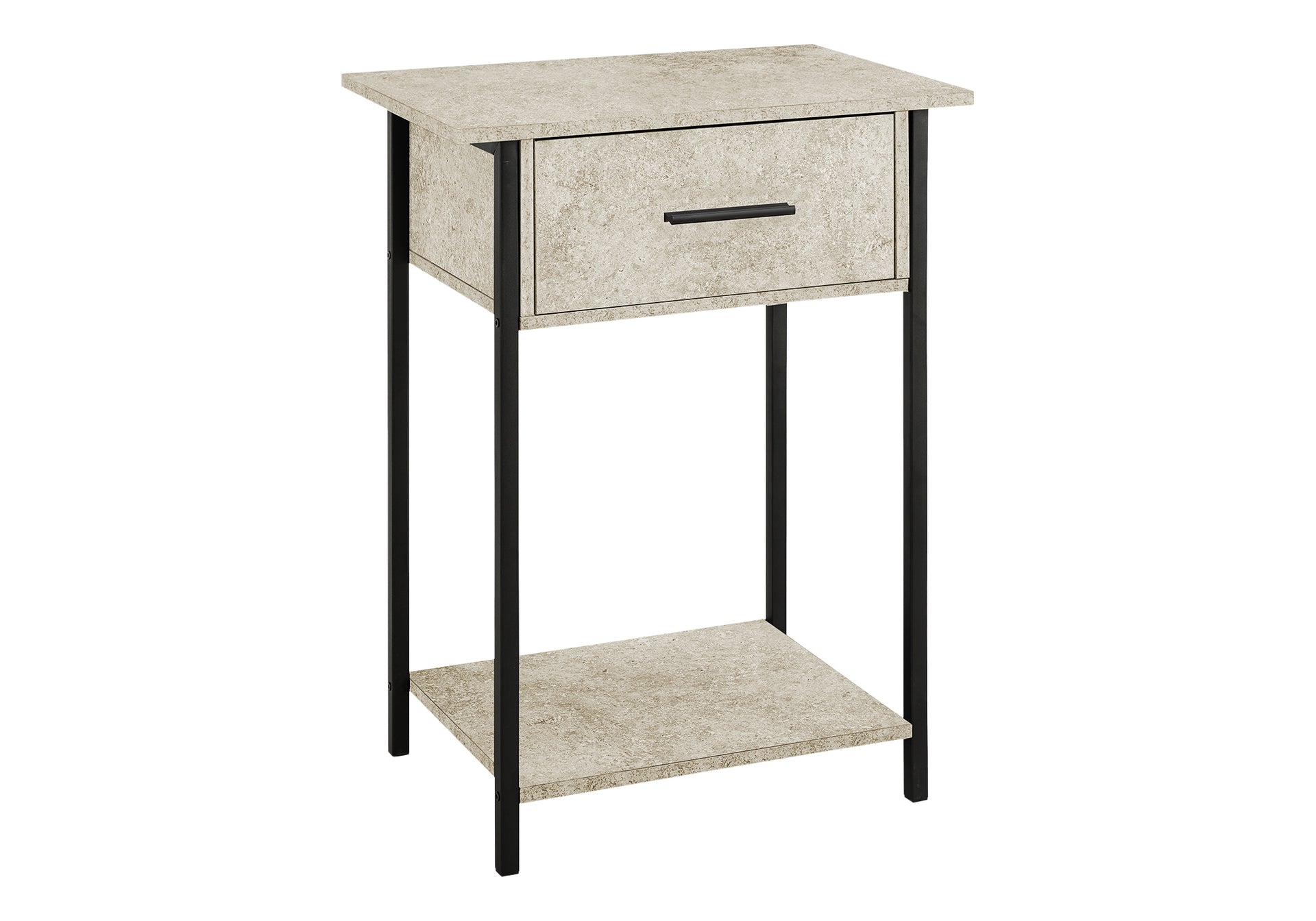 Elevate the style in your living room with this fashionable 2-tier accent table. The sleek design features a cream stone laminate finish and black metal legs, adding a contemporary touch to your space. The practical shelf at the bottom and convenient storage drawer with a...