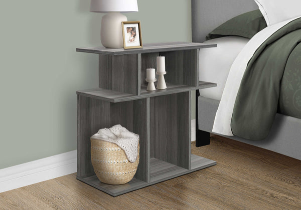 Embellish your space with this solid, beautifully crafted contemporary style rectangular side table finished in a chic grey wood look. Featuring clean lines and 6 open concept display shelves, this practical accent table is perfect for showcasing your favorite decorative pieces, or a small plant,...