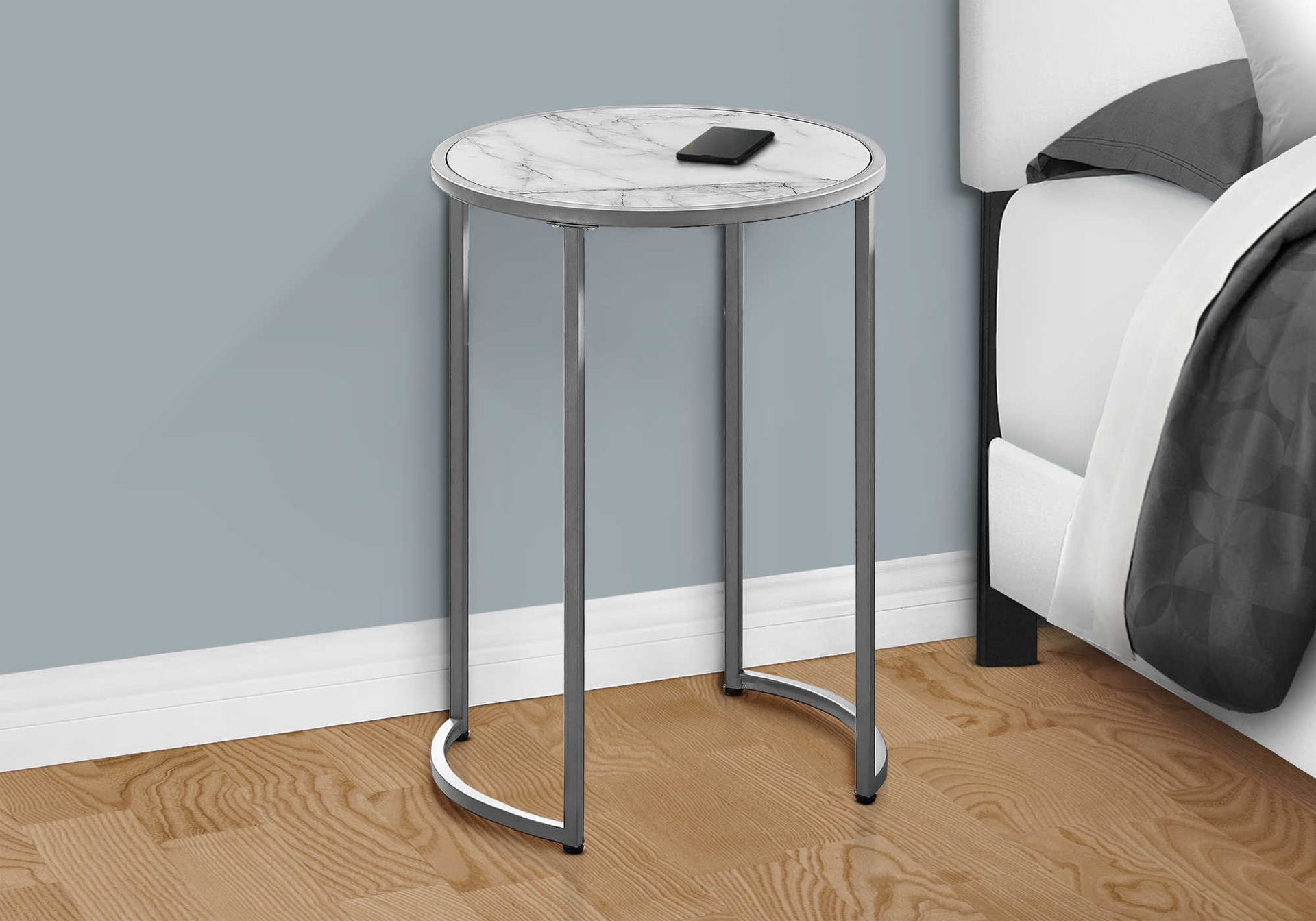 Style comes full circle with this round accent table. The white marble-look tabletop is bordered by a silver metal frame that extends down to the curved, U-shaped metal base. This versatile side table is ideal in any room as a convenient surface to place items...