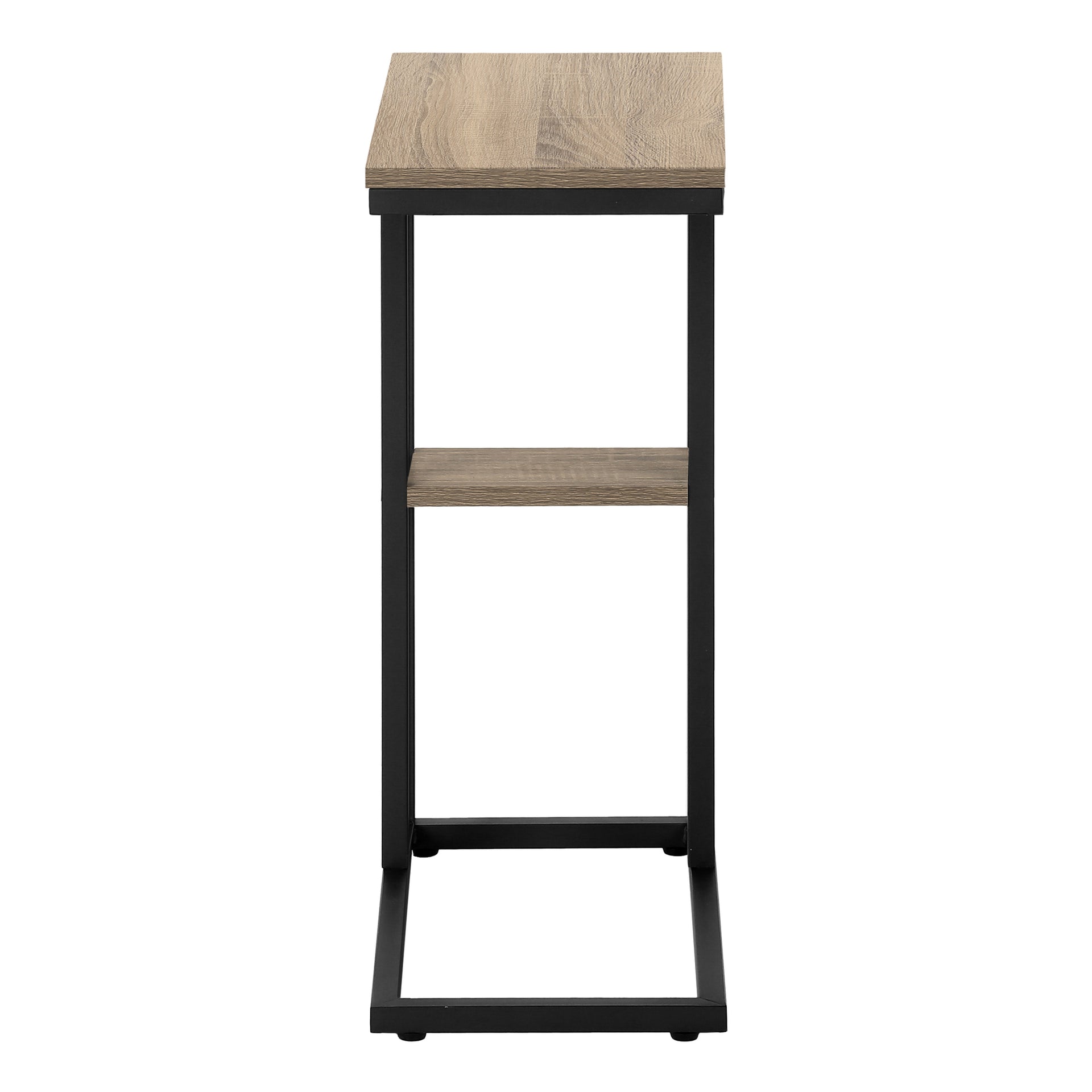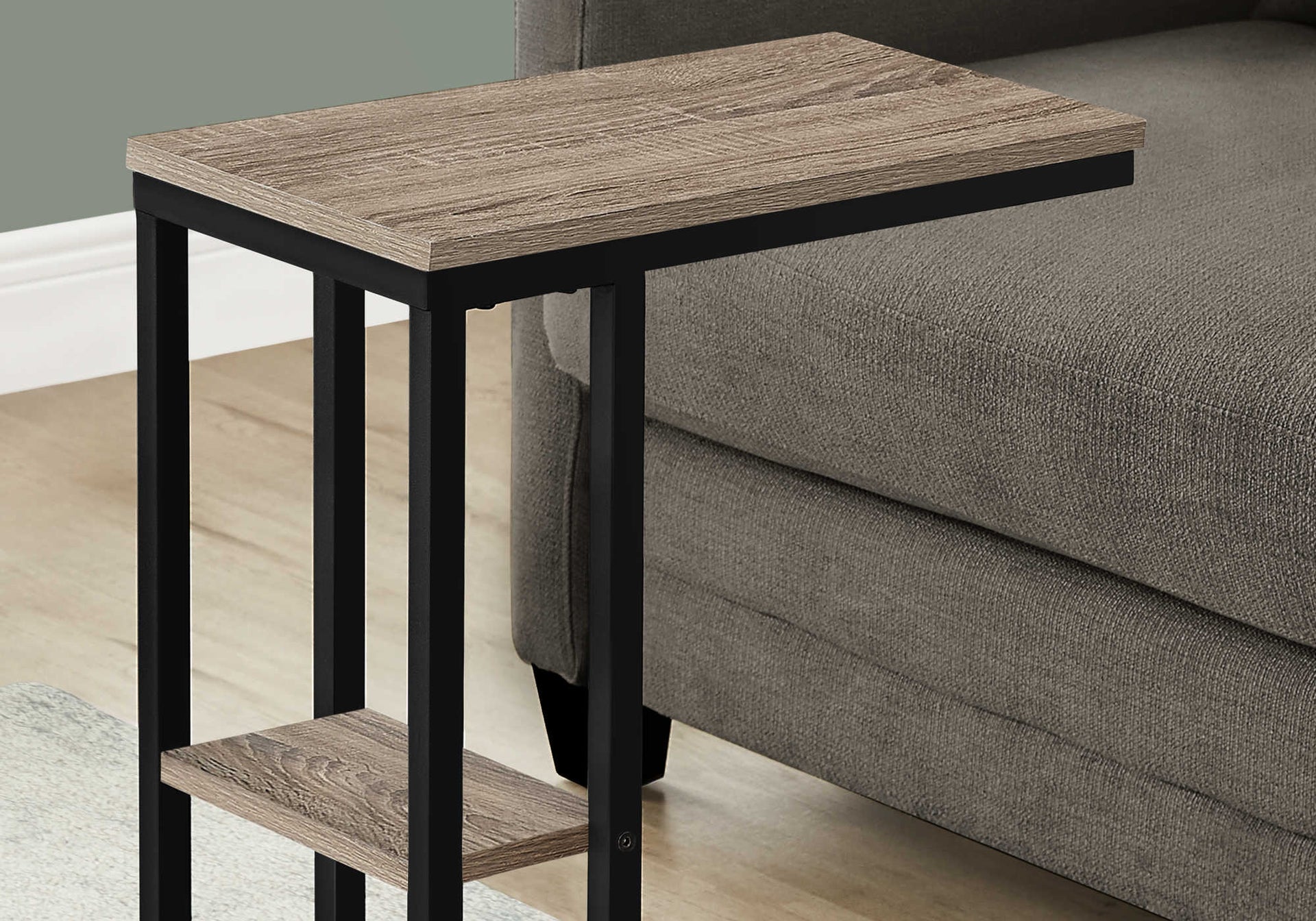 Straight lines and clean angles give this C-shaped accent table an elegantly modern look. The rectangular tabletop in a dark taupe wood-look finish is supported by a black metal frame with a secondary shelf underneath the table for convenient placement of smaller items. Slide this...