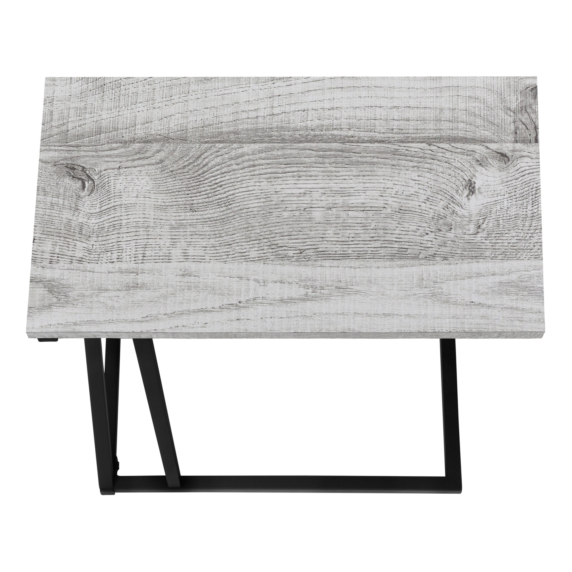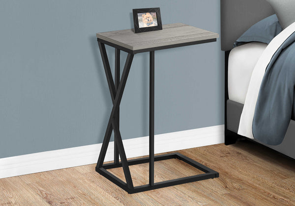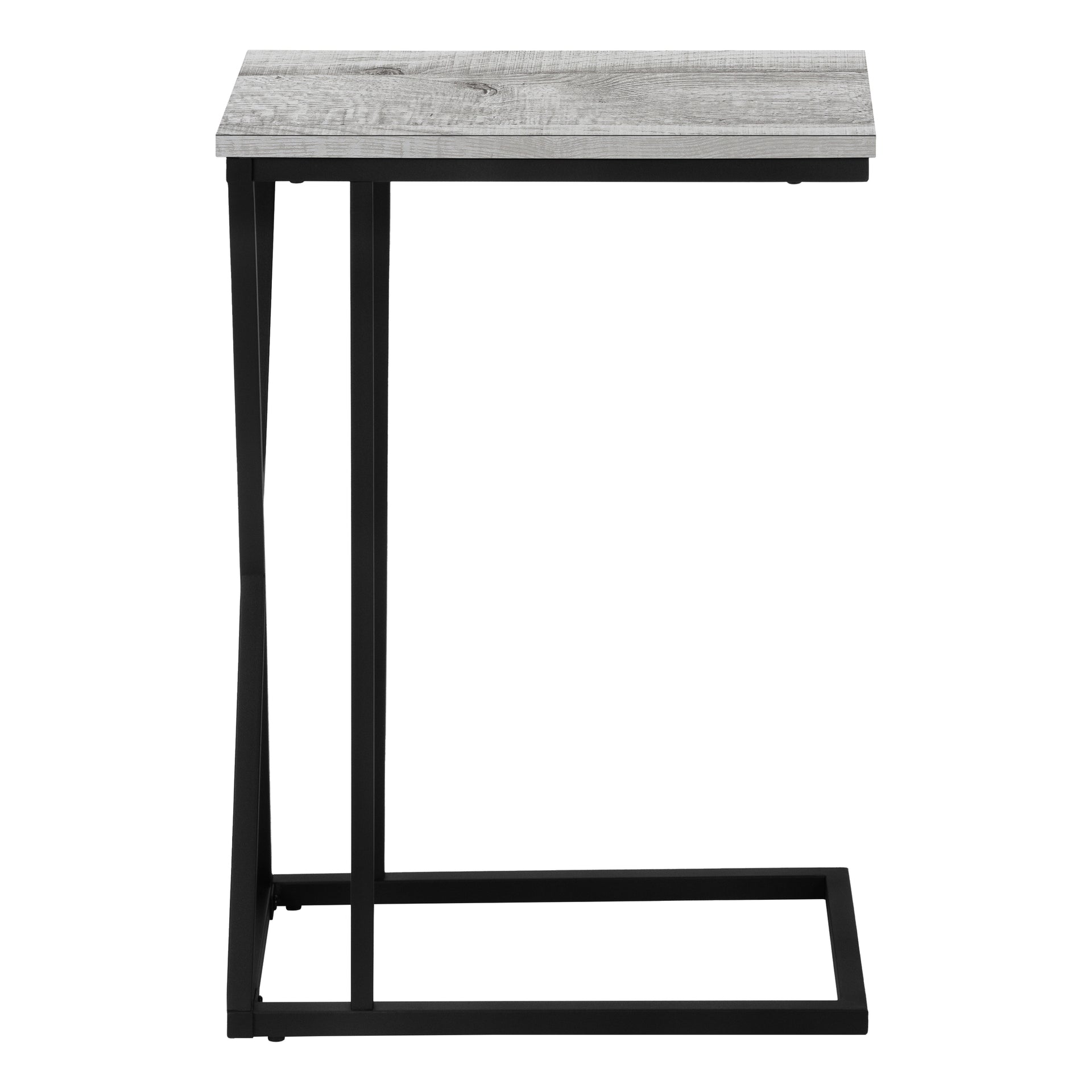 Straight lines and clean angles give this C-shaped accent table an elegantly modern look. The rectangular tabletop in a smooth, grey wood-look finish is supported by the black metal frame with intersecting lines that form two asymmetrical triangles. Slide this versatile end table under a...