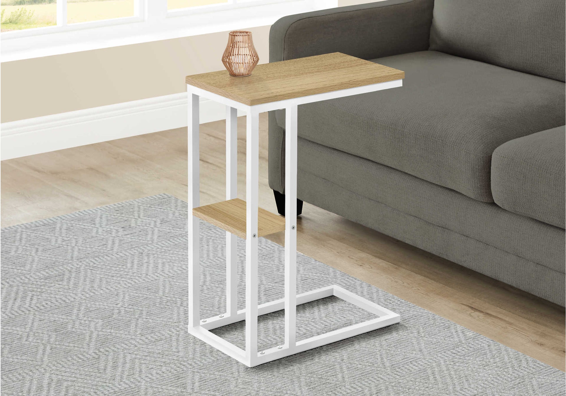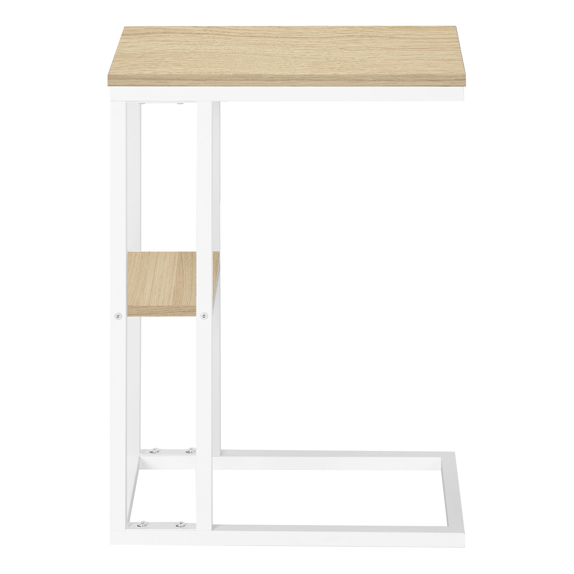 Straight lines and clean angles give this C-shaped accent table an elegantly modern look. The rectangular tabletop in a natural wood-look finish is supported by a white metal frame with a secondary shelf underneath the table for convenient placement of smaller items. Slide this versatile...