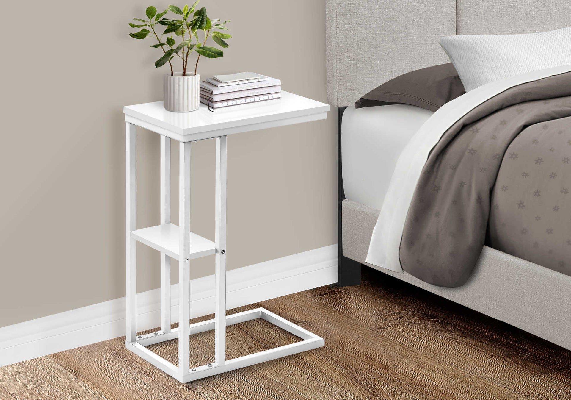 Straight lines and clean angles give this C-shaped accent table an elegantly modern look. The rectangular tabletop in a white finish is supported by a white metal frame with a secondary shelf underneath the table for convenient placement of smaller items. Slide this versatile end...