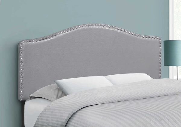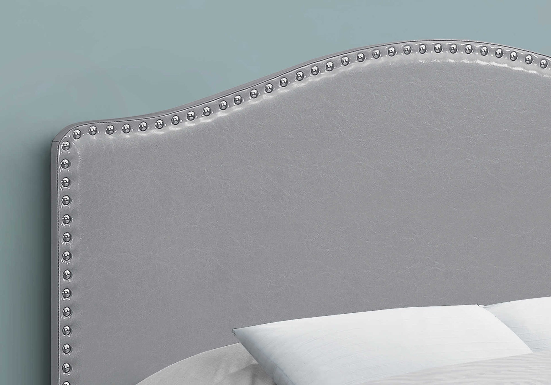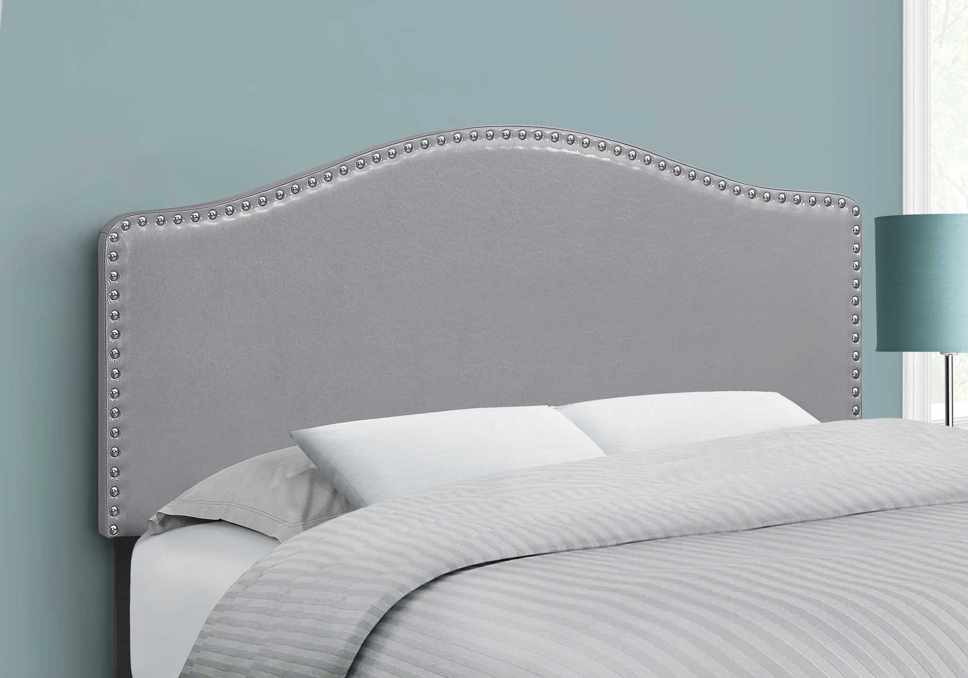 Combining modern materials and a classic silhouette, this upholstered headboard panel in a grey leather-look fabric brings timeless style to any bedroom. Silver-finish nailheads create an eye-catching frame around the gently arched top and straight sides. Upholstered with extra padding and smooth-to-the-touch fabric, this headboard...