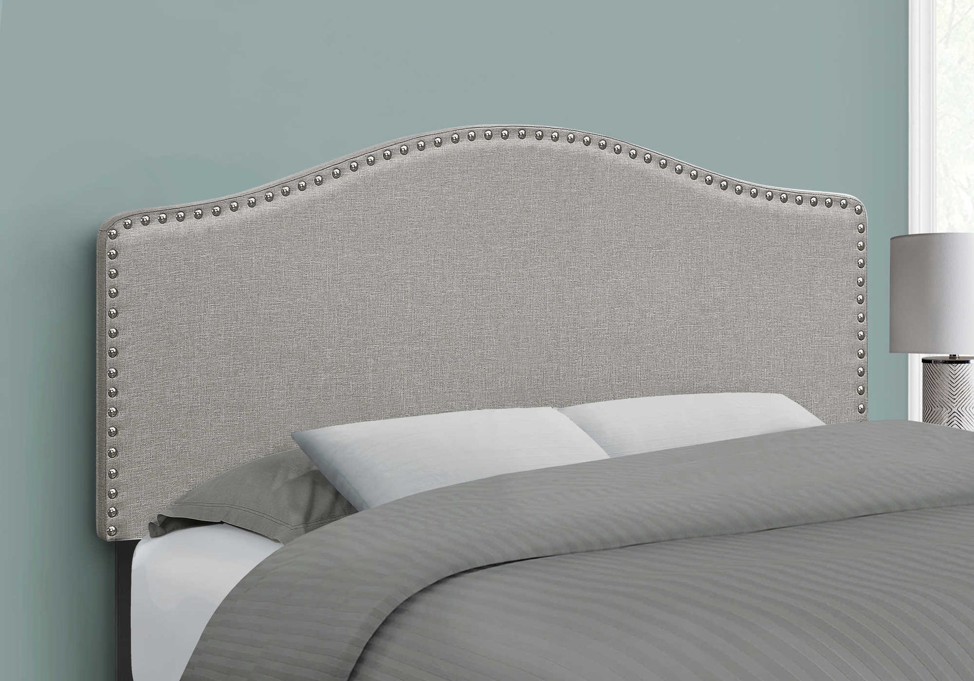 Combining modern materials and a classic silhouette, this upholstered headboard panel in a grey linen-look fabric brings timeless style to any bedroom. Chrome-finish nailheads create an eye-catching frame around the gently arched top and straight sides. Upholstered with extra padding and smooth-to-the-touch fabric, this headboard...
