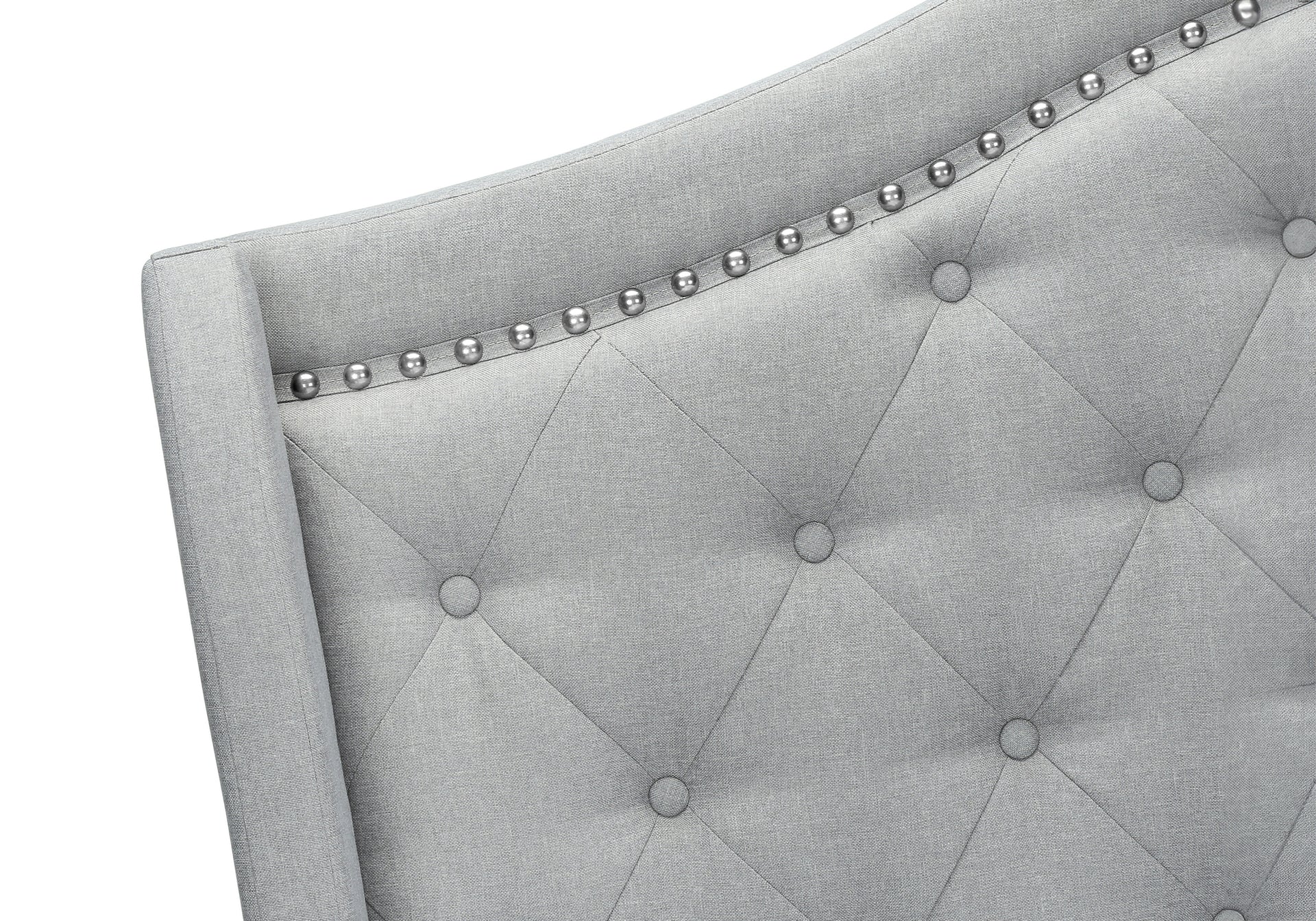 Give your bedroom a master appearance with this luxurious queen size bed frame and wing back headboard, upholstered in an elegant grey linen-look fabric. The gently curved classic style of this floor length headboard, outlined with a chrome nailhead trim...