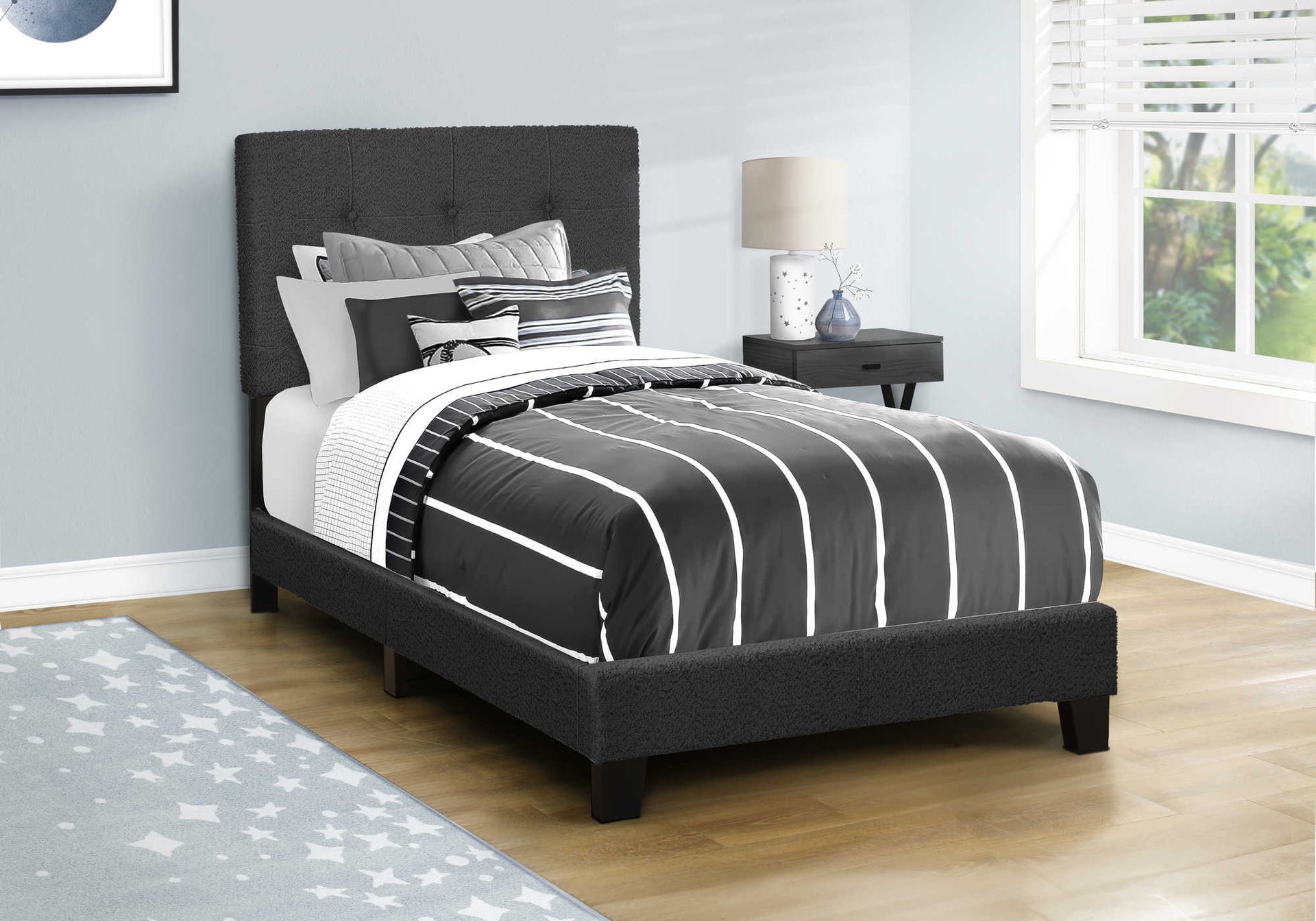 Create a fashionable style bedroom space for a youth with this trendy, twin size bed frame in a black boucle fabric and black block style plastic feet. This transitional style upholstered bed is designed with a classic, button-tufted padded headboard for comfortable support. The sturdy...