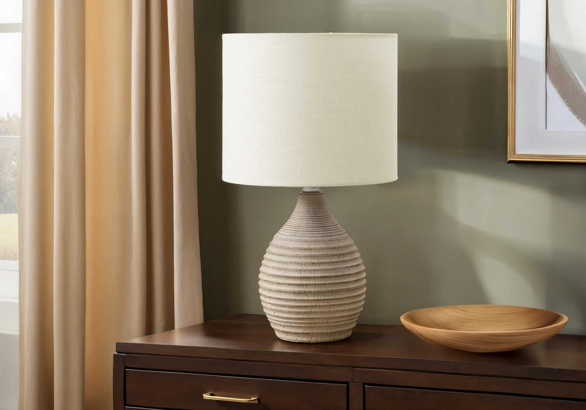 Brown Resin Table Lamp Brighten up your contemporary living room, bedroom, or office with this elegant 17"h table lamp. Crafted in sturdy brown resin with a ribbed textured finish base designed to look like stone, this decorative accent lamp effortlessly complements any end or side...