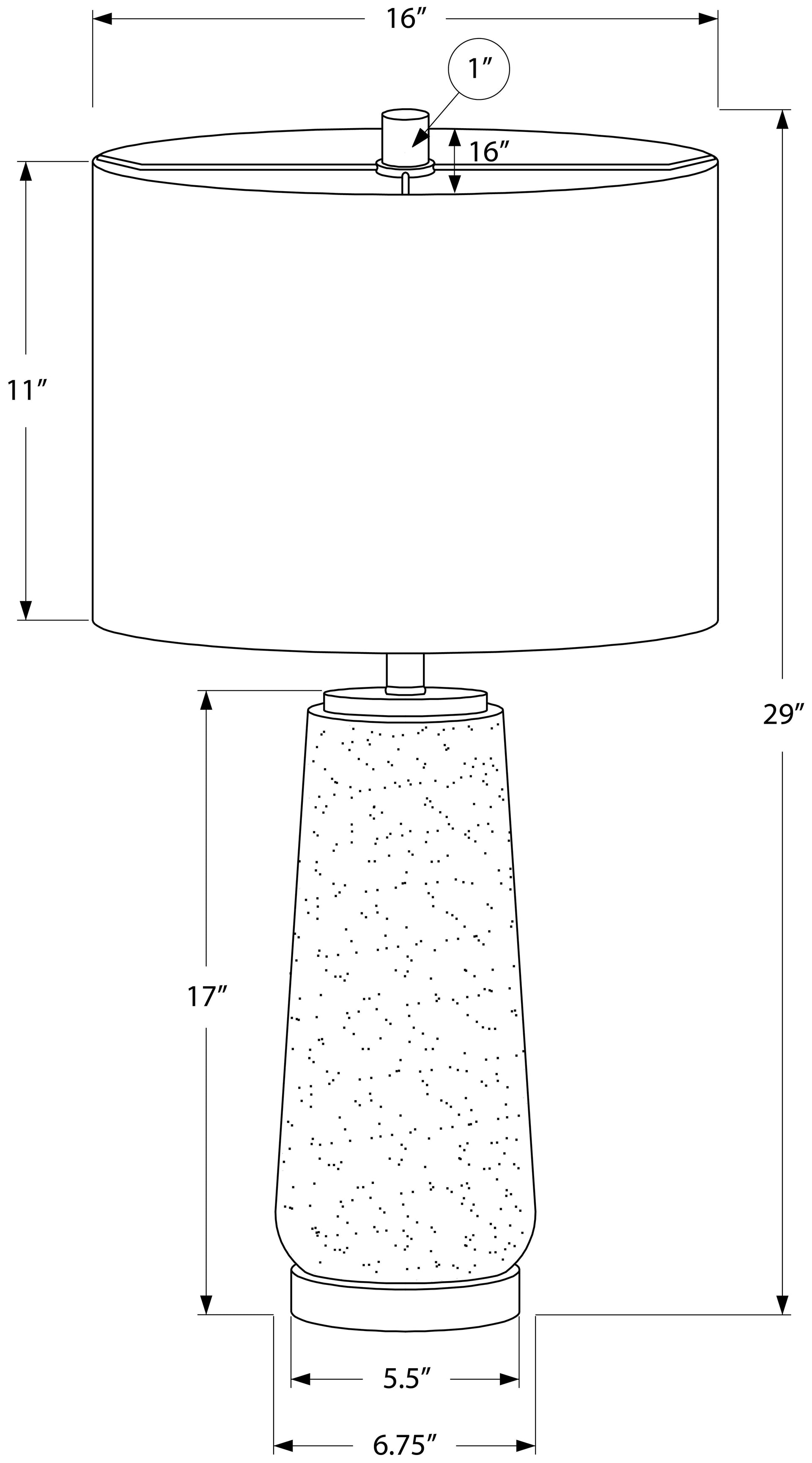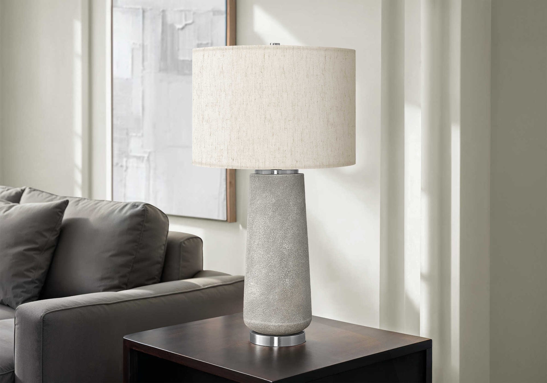 Grey Metal Table Lamp Make your room shine with this stylish and fashionable 29"h table lamp! The modern designed, grey resin cylinder textured base and polished silver metal accent is topped with a ivory linen drum shade, and finished with an elegant silver finial. Attached...