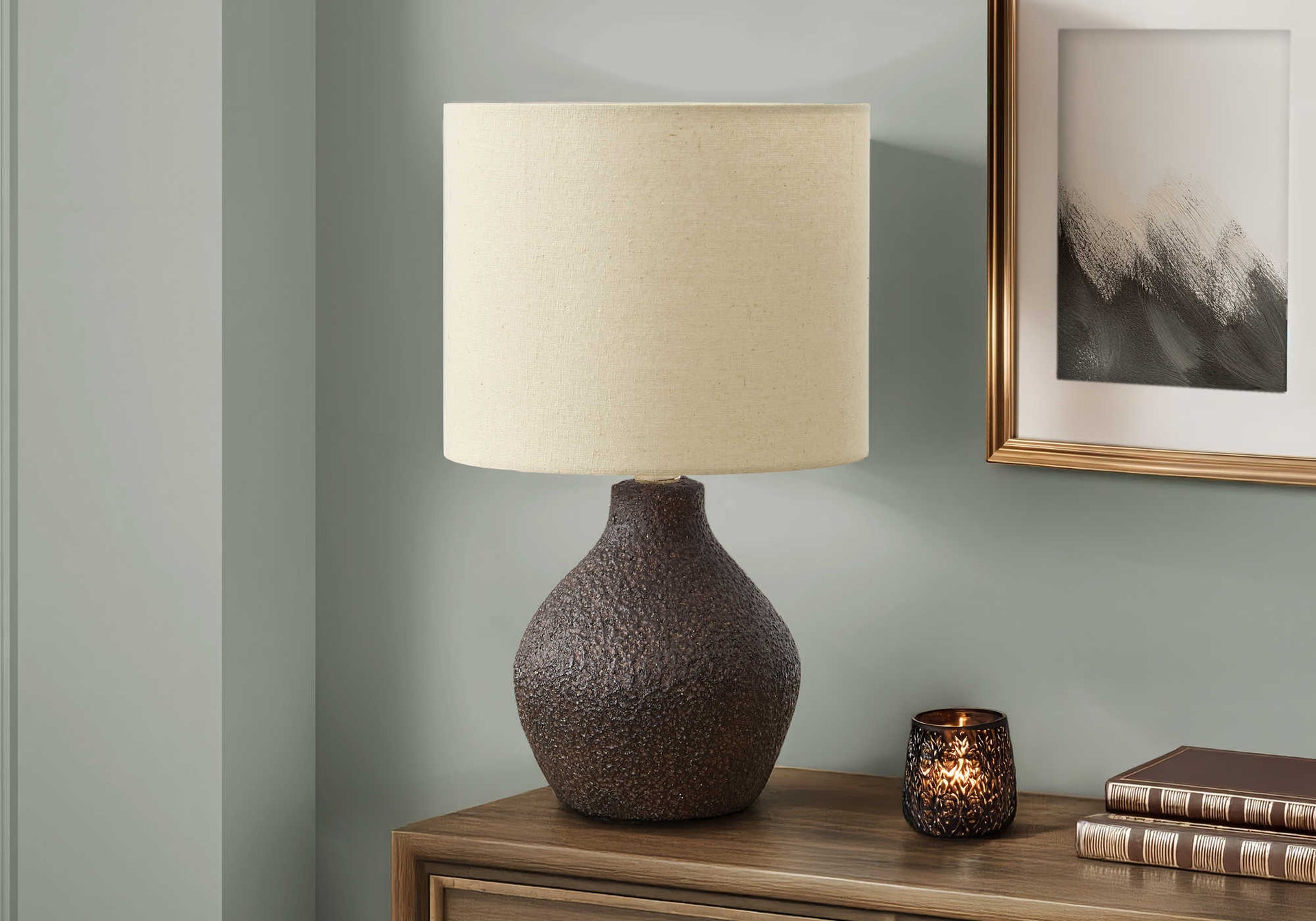 Illuminate and transform your living room, bedroom or office into a haven of style and comfort with our 16"h table lamp with a textured brown resin base. This fashionable and trendy contemporary piece is not just a source of lighting but a statement accent piece...