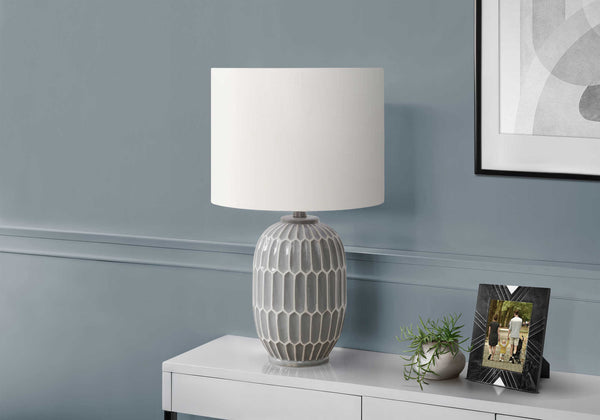 Grey Shade Silver Floor Lamp Illuminate your space with our chic and contemporary 62"H floor lamp with a convenient built-in shelf table. Crafted with sturdy grey metal with a circular metal base with a white marble-look metal shelf table, and...