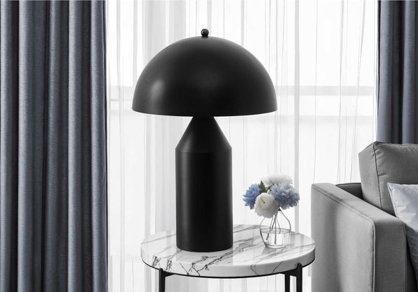 Introducing the ultimate in modern and stylish lighting with this 23"h black metal table lamp that adds a chic and contemporary statement in a living room, bedroom, or office. The mushroom-like dome metal shade brings a modern, retro vibe to this decorative lamp when placed...