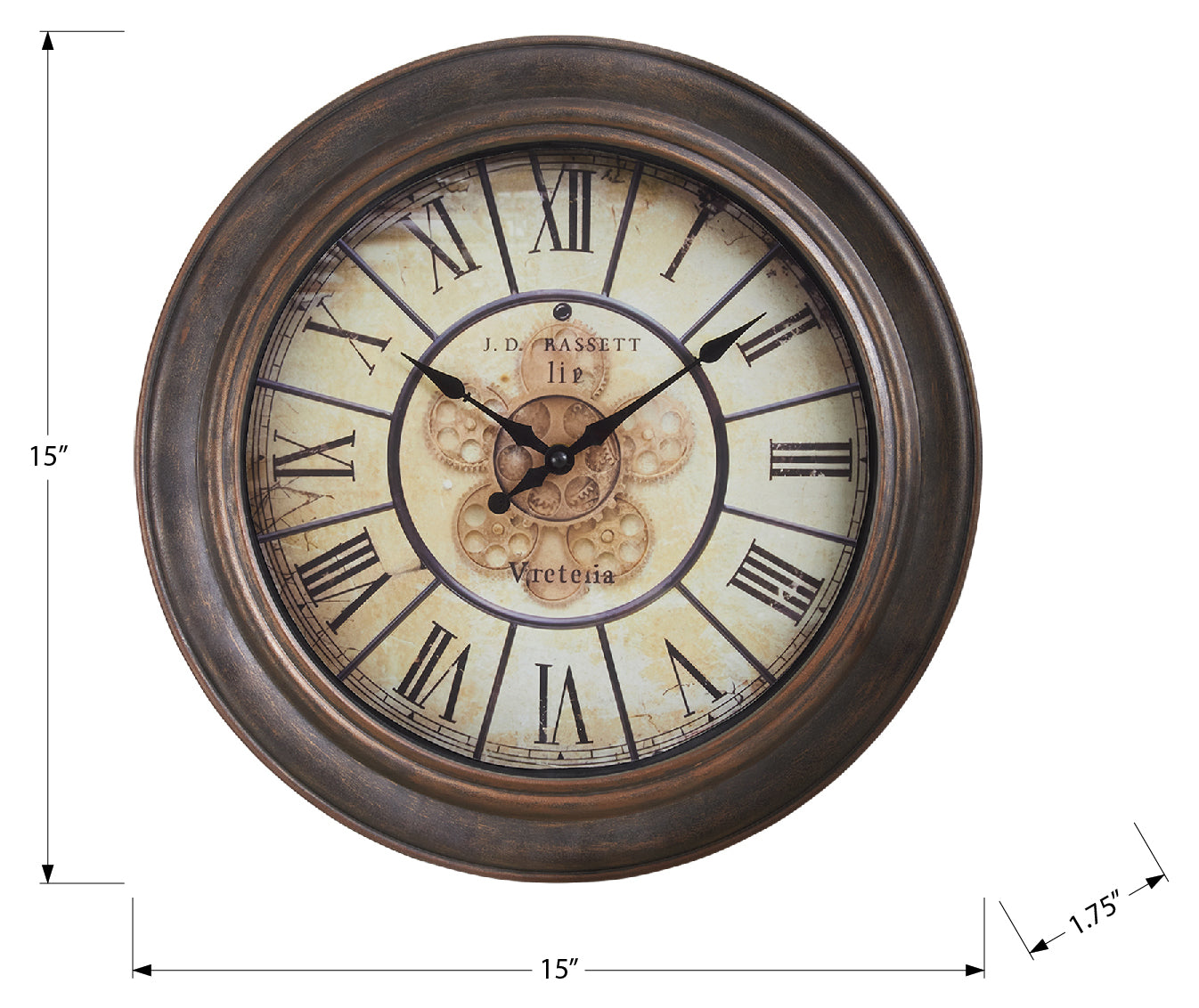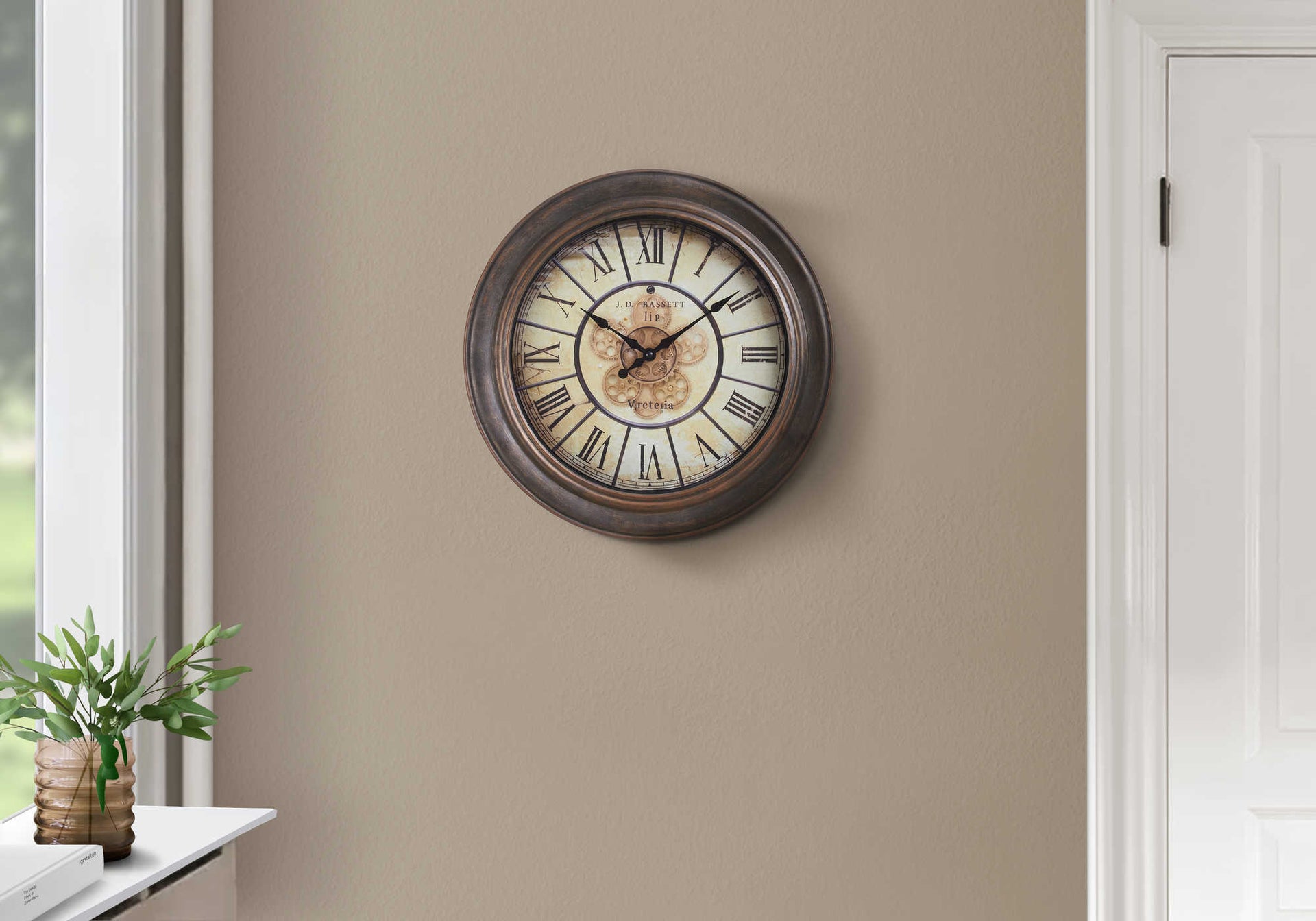 Add a hint of vintage vibes to your home decor with this beautiful 16" round wall clock in an antique brown finish. The transitional design features a light and sturdy brown plastic frame with a rubbed antique finish and a...