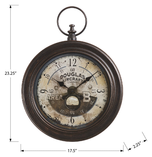 Add a touch of nostalgia to your home with this 18" round wall clock in a pocket-watch design with an antique brown finish. This wall clock is sure to be a focal point with its durable plastic frame, easy to read numerical markings against a...