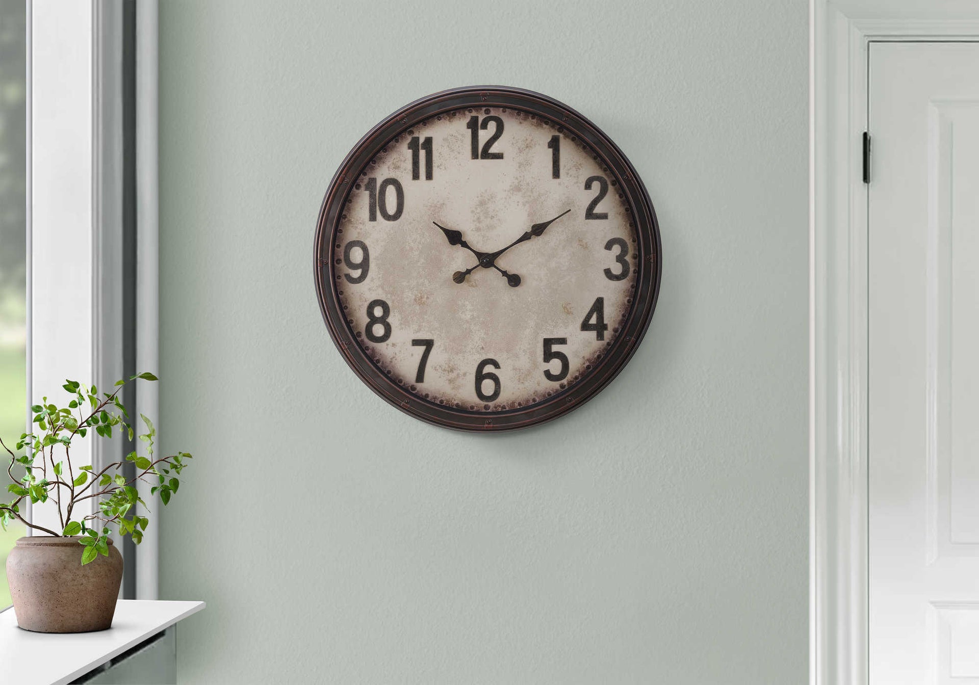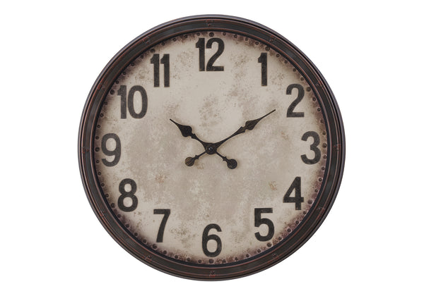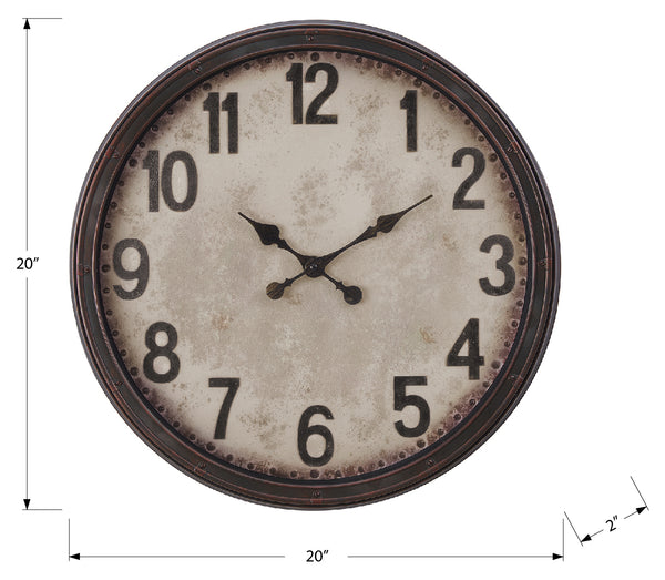 Add a touch of vintage charm to your home decor with this stunning 20" round wall clock. The easy to read analog clock features bold numerical markings on a parchment style paper background under a clear glass surface, all housed around a durable antique brown...