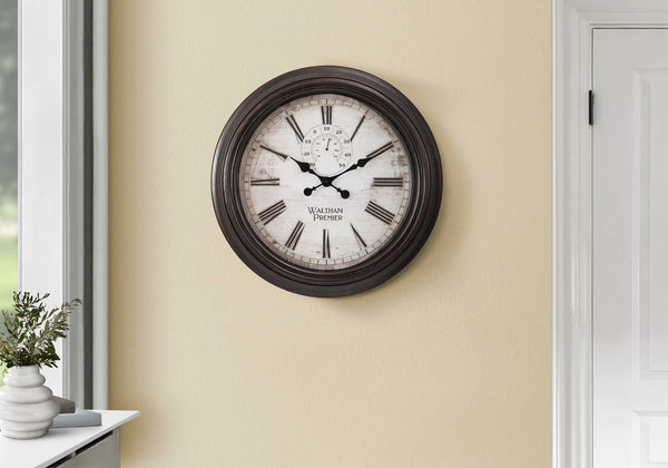 Add a touch of sophistication to your living space with this stylish 20" round wall clock in a dark brown hue with subtle vintage detailing. This decorative accent piece is encased with a thick, molded plastic frame and metal hands with an antique look under...