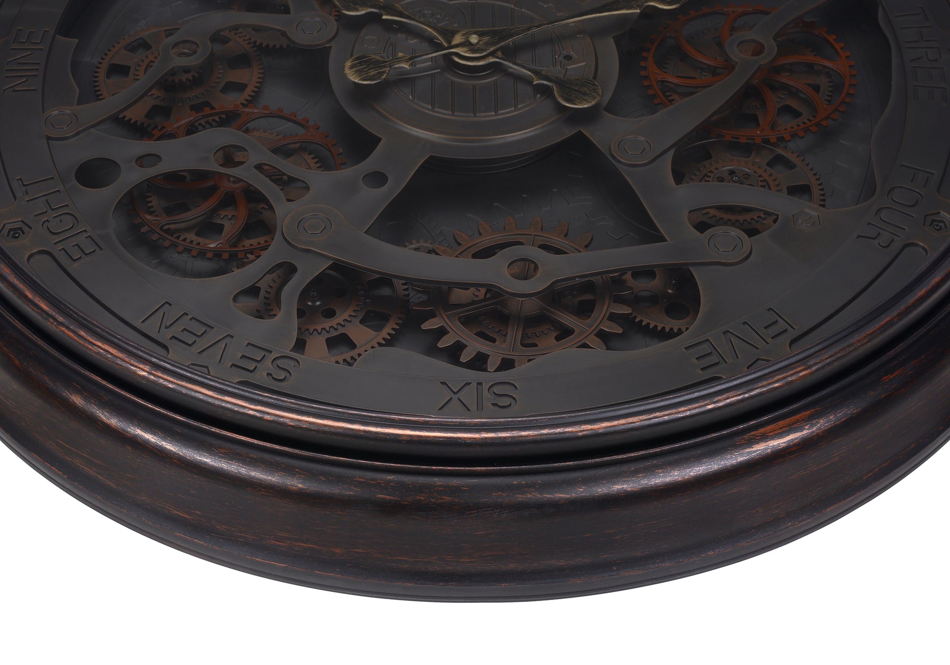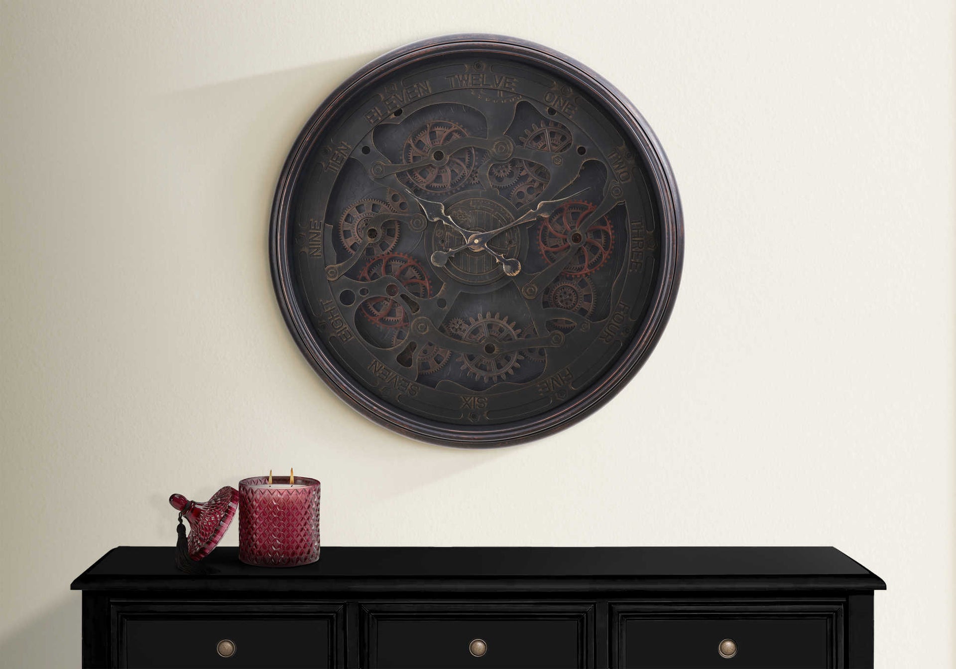Add some sophistication to your home decor with this stunning 30" round wall clock with an exposed gear mechanism. The sleek black plastic frame on this large, oversized clock surrounds a clear glass surface showcasing the metal gears in motion, for a stylish look to...