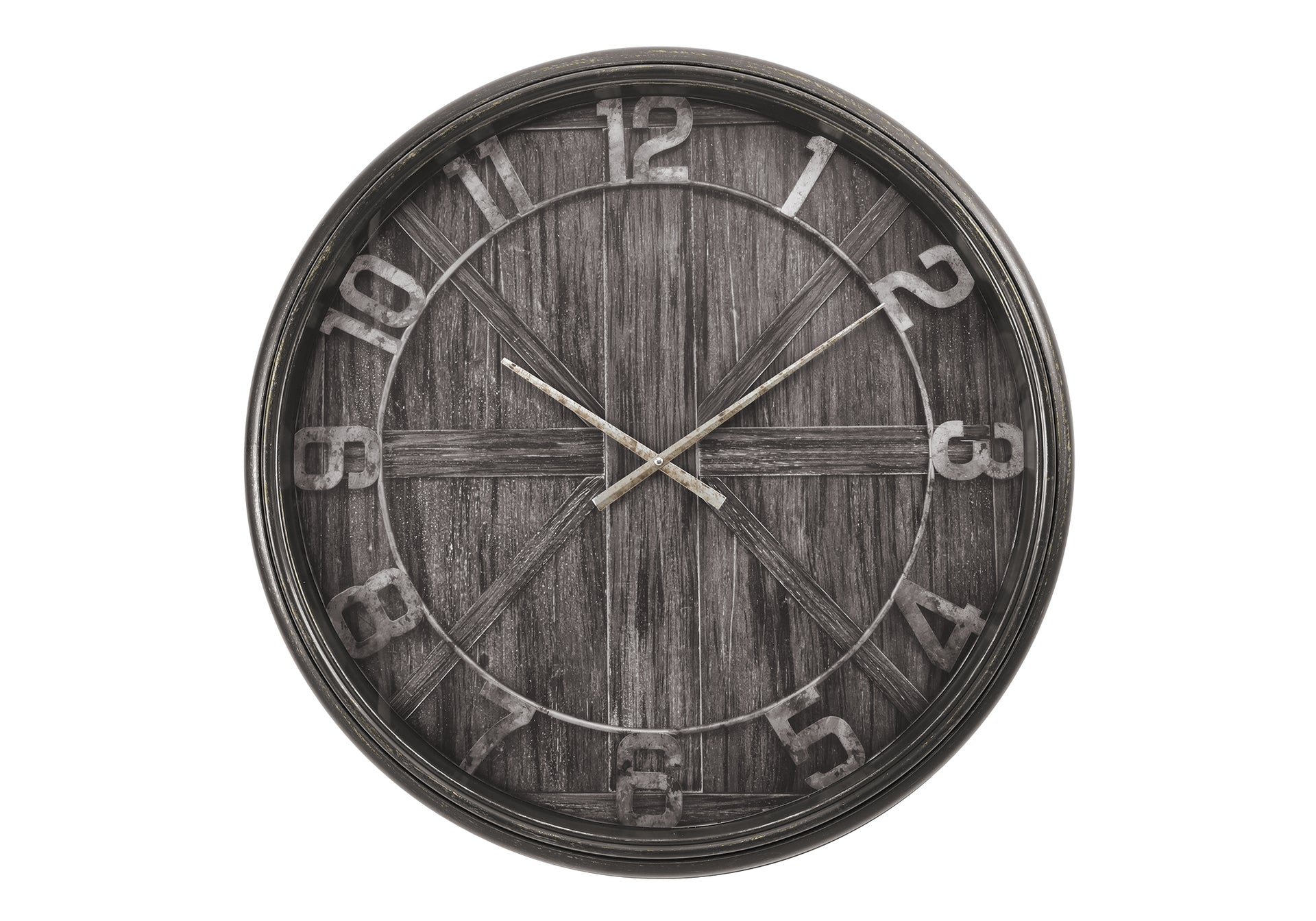 Stay ahead of the trend with this stylish 30" round wall clock in a chic brown finish. This large oversized clock features a durable glass surface and plastic frame with a wood-look printed face, for a touch of rustic sophistication in transitional home decors. The...