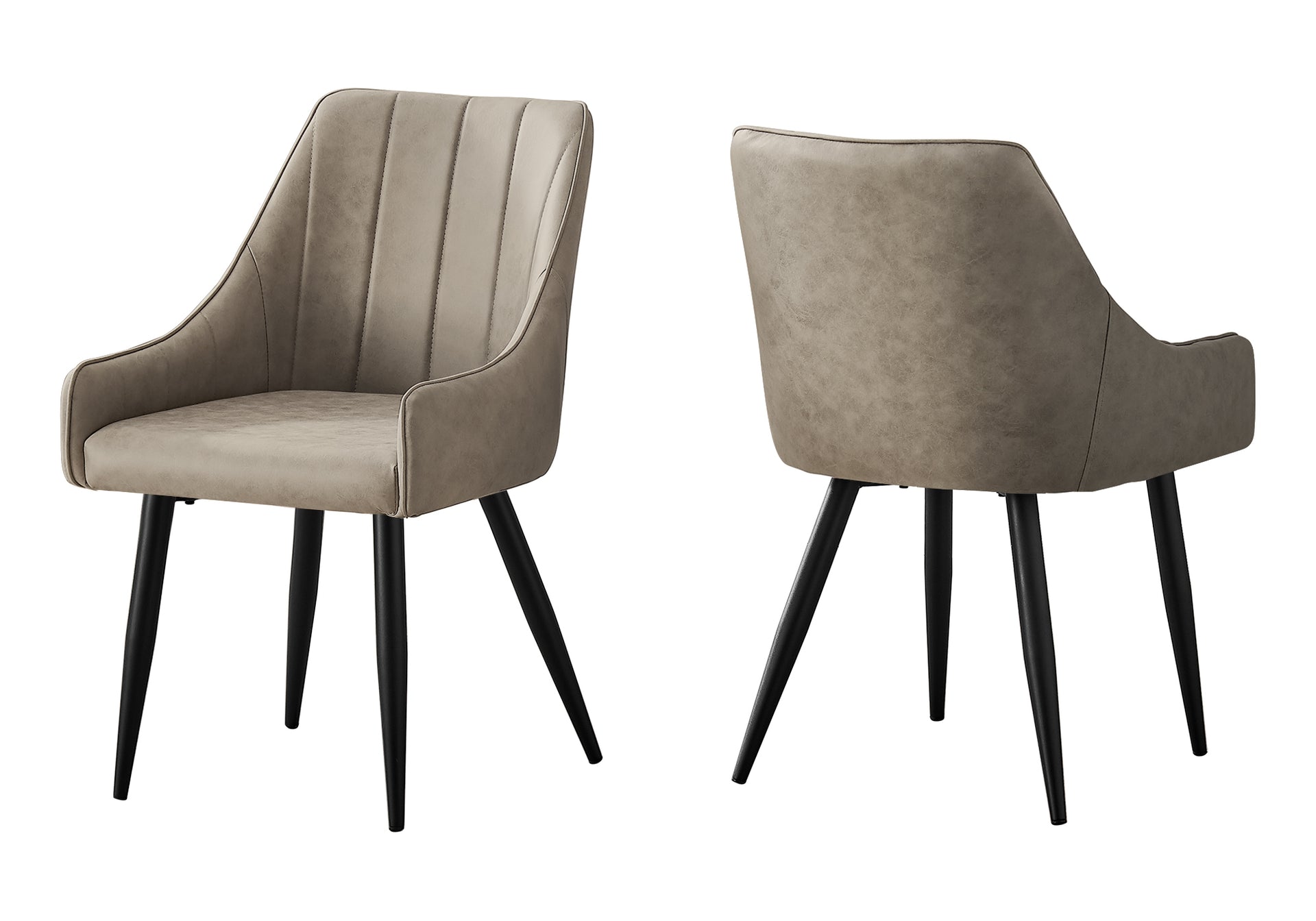 You'll want to remain seated at the table in these supremely comfortable upholstered dining chairs in a taupe distressed leather-look fabric. With vertical channel tufting for a luxurious feel, the padded back and sides curve around the seat and slope down to form low, integrated...