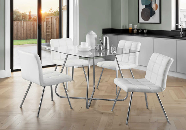 Transform the look of your dining space with this contemporary 5-piece white dining set. This dining set includes a 40" long rectangular table, three chairs, and a bench that accommodates up to 4 people making it perfect for casual family...
